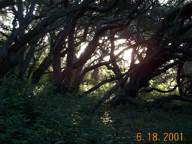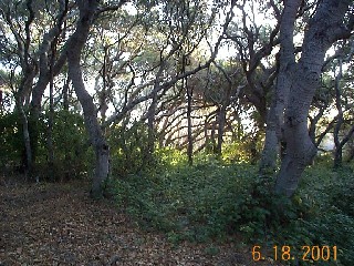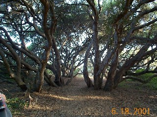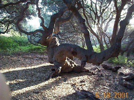 Introduction, from Los Osos - Baywood Park Chamber of Commerce: Watch for small signs and a parking lot on the south side of Los Osos Valley Road, ½-mile east of South Bay Boulevard. An easy one-mile trail leads visitors under the low canopy of "Pygmy Oaks," dwarfed oaks that are 600 to 800 years old. The leaf-covered trail winds among the trees' gnarled gray trunks and the mushrooms, wild cucumbers, hollyleaf cherry and other flora that exist in this shaded land where Chumash Indians once lived. Visitors should be wary of a prolific member of the reserve's plant community - poison oak. Avoid its shiny "leaves of three" lining the trail in many places. |